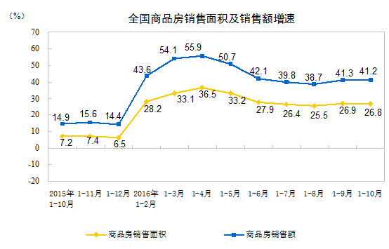 1-10月份,商品房銷售面積120338萬平方米,同比增長26.8%,增速比1-9月份回落0.1個百分點。其中,住宅銷售面積增長27.0%,辦公樓銷售面積增長36.1%,商業(yè)營業(yè)用房銷售面積增長19.3%。商品房銷售額91482億元,增長41.2%,增速回落0.1個百分點。其中,住宅銷售額增長42.6%,辦公樓銷售額增長56.5%,商業(yè)營業(yè)用房銷售額增長23.2%。