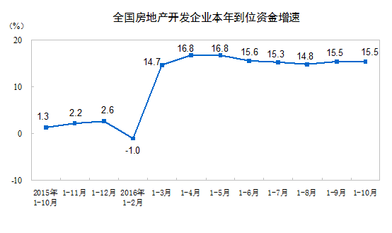 1-10月份,房地產(chǎn)開發(fā)企業(yè)到位資金117261億元,同比增長15.5%,增速與1-9月份持平。其中,國內(nèi)貸款17303億元,增長1.2%;利用外資123億元,下降49.0%;自籌資金40764億元,增長0.6%;其他資金59071億元,增長35.2%。在其他資金中,定金及預(yù)收款33655億元,增長32.2%;個人按揭貸款19783億元,增長51.5%。