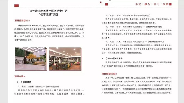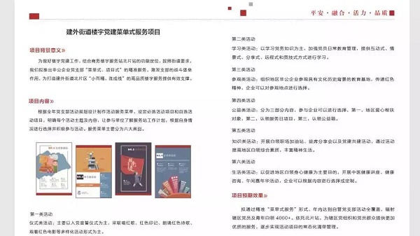 為深入推進地區區域化黨建工作,強化黨組織凝聚力、引領力、戰斗力,進一步促進資源共享、融合發展,2019年,街道重點推出6個黨建課題項目,項目圍繞“兩個環境,一個責任”(打造宜居環境、優化營商環境、履行企業責任),是街道樓宇黨建服務站、企業、社區三個方面的代表,充分體現了建外黨建統領能力,為建外街道區域化黨建開展提供了抓手,增強了動力。
